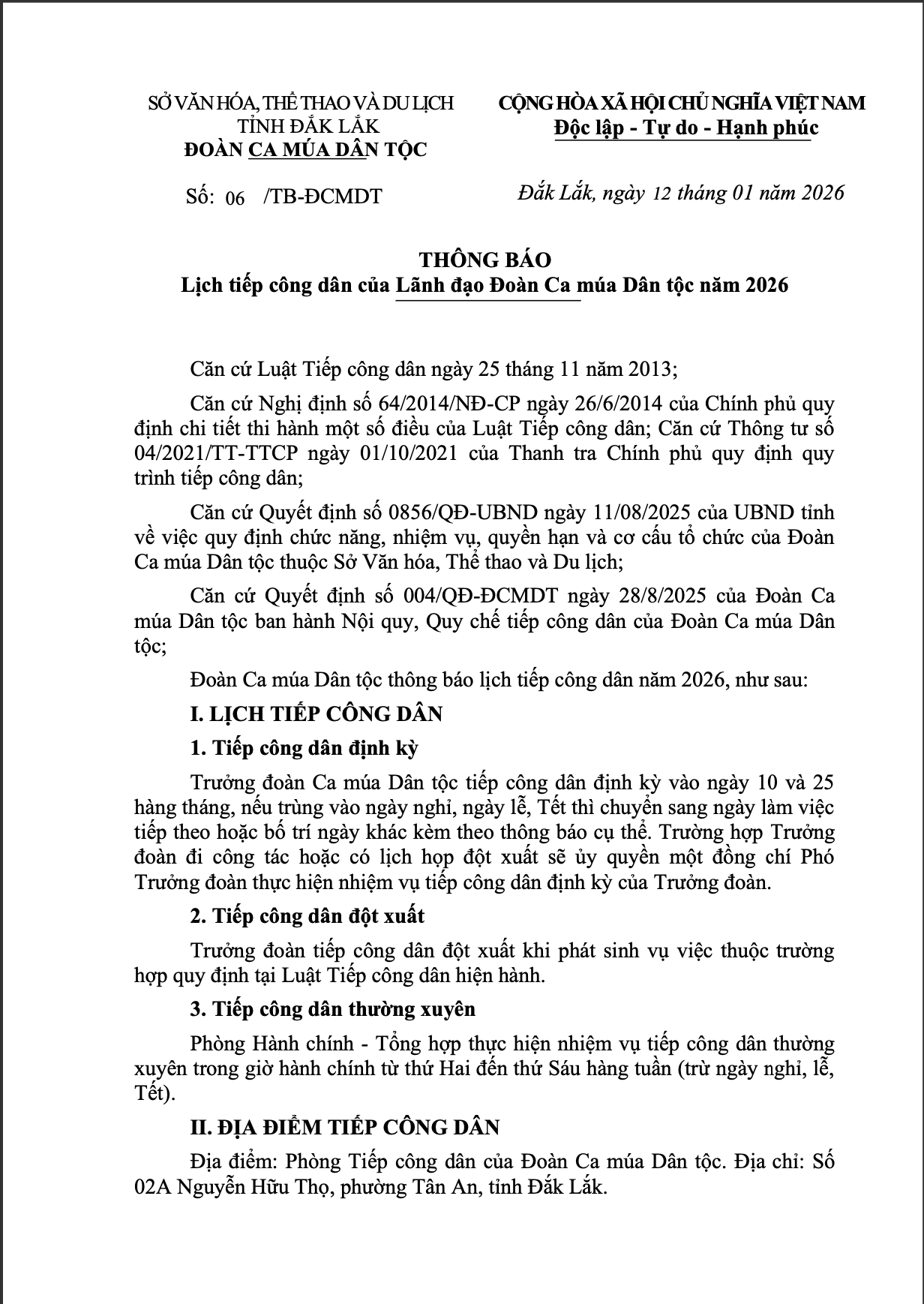 THÔNG BÁO Lịch tiếp công dân của Lãnh đạo Đoàn Ca múa Dân tộc năm 2026